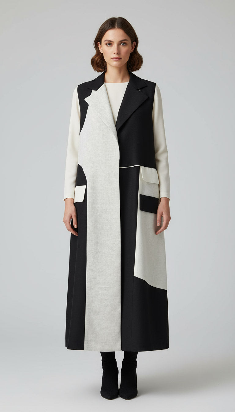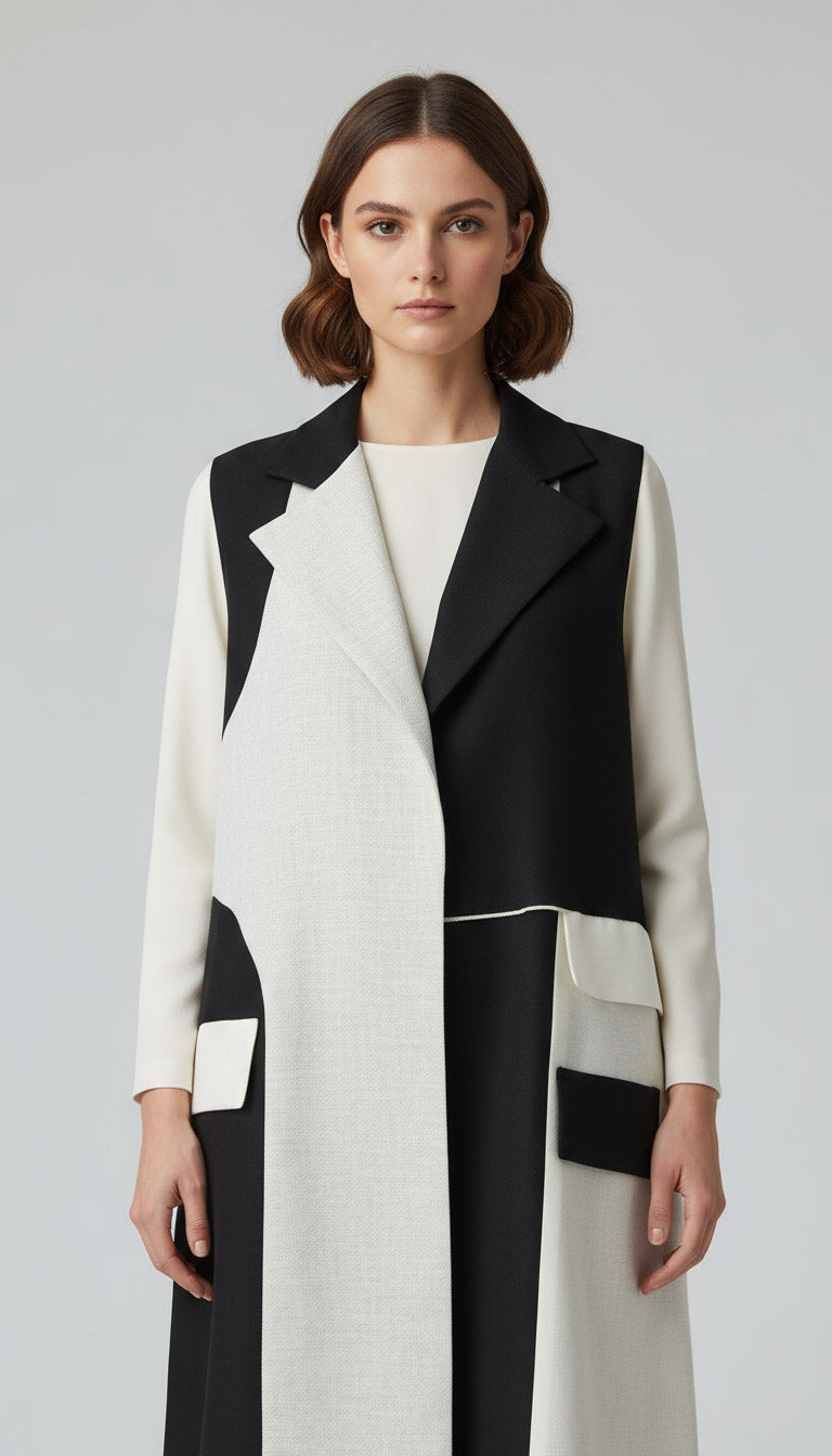 عباية فخمة بتصميم يجمع بين الأبيض والأسود بأسلوب أنيق يعكس الذوق الرفيع. مثالية للمرأة التي تبحث عن لمسة من الفخامة بتصميم راقٍ وبسيط.