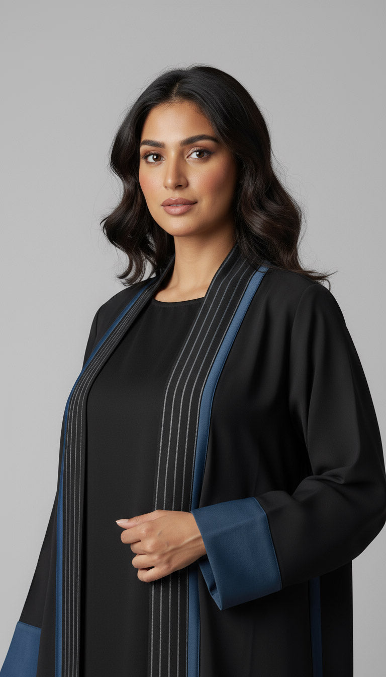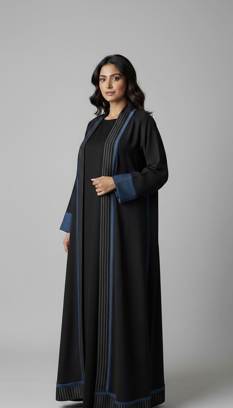 A luxurious black abaya featuring refined blue edges and white lines for a modern, elegant touch. Perfect for women who appreciate timeless sophistication with a hint of contemporary style.