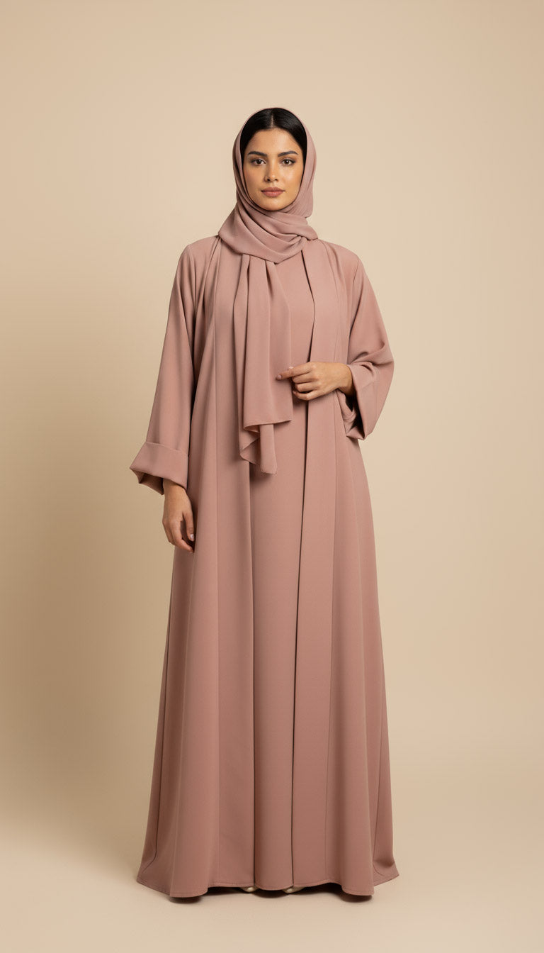 A nude-colored abaya paired with a matching dress and shayla, offering an elegant and practical look for everyday wear.