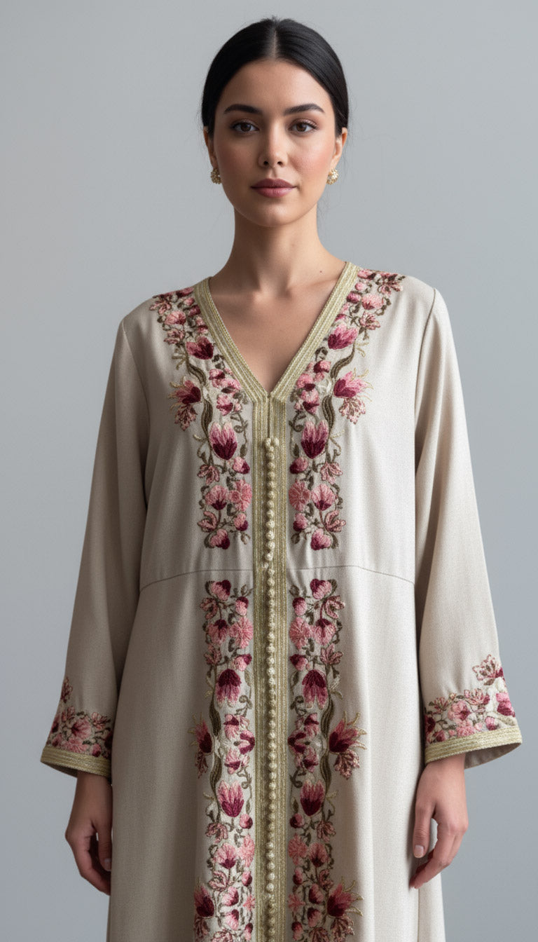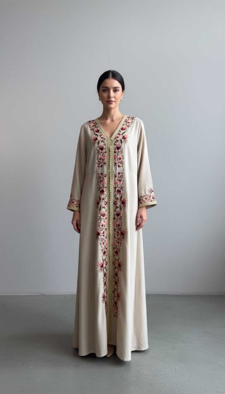 Luxurious Moroccan jalabiya with rich embroidery and a matching belt — combining tradition with refined elegance.