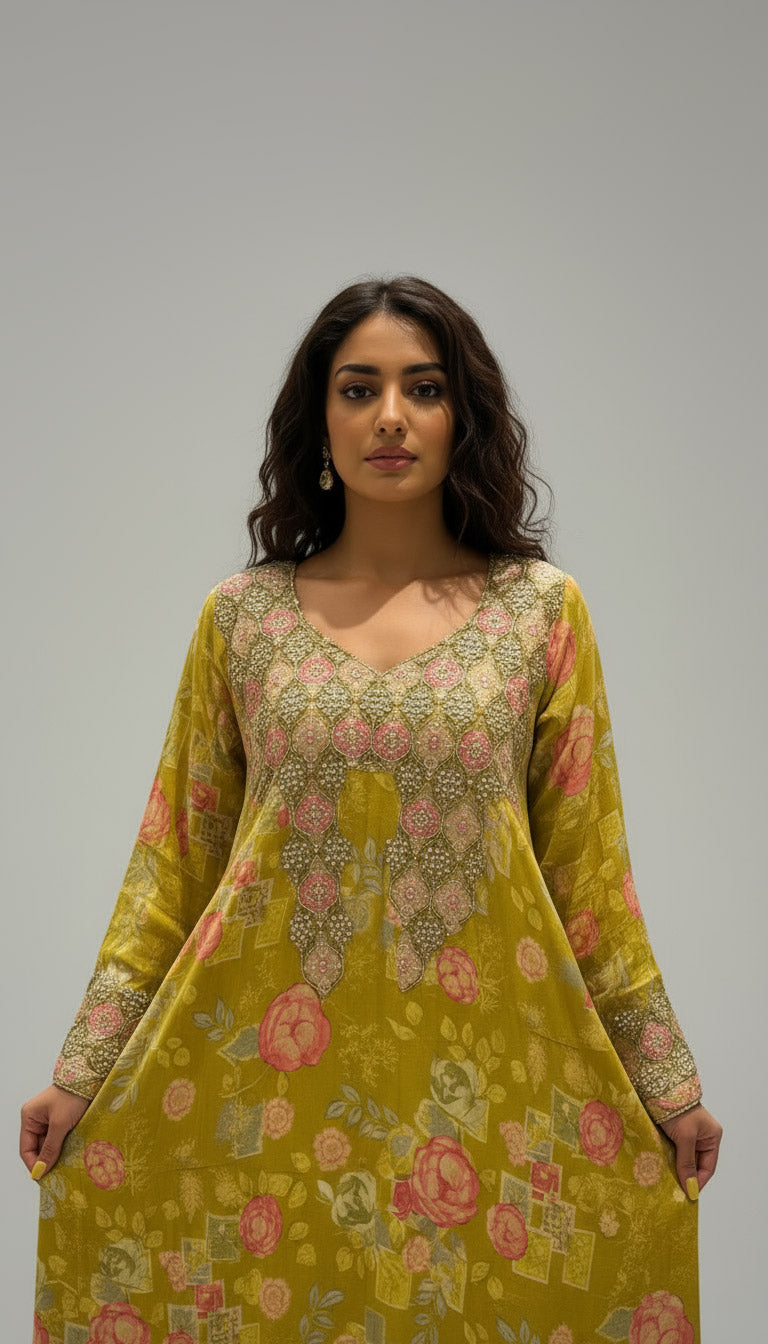 مخور من القطن الهندي باللون الزيتوني، مزين بتطريز فاخر يضفي لمسة من الأناقة والفخامة.