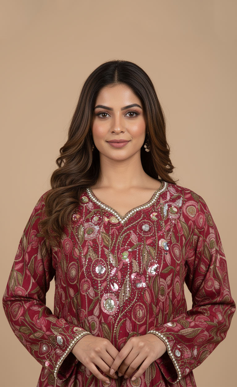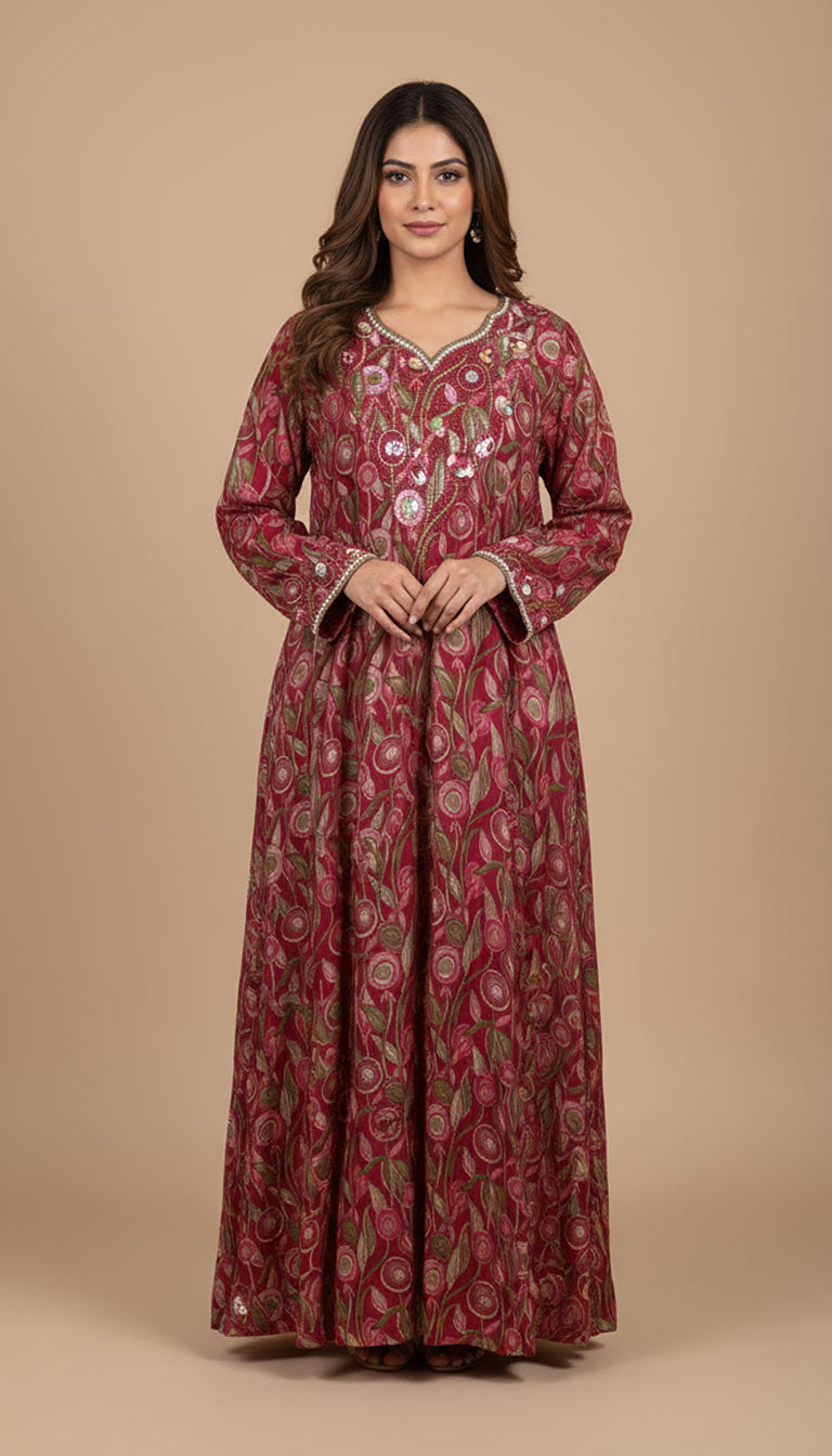 مخور فاخر من القطن الهندي باللون الأحمر المزهر، مزين بتطريز دقيق يضفي لمسة راقية من الأناقة والفخامة على تشكيلتك.